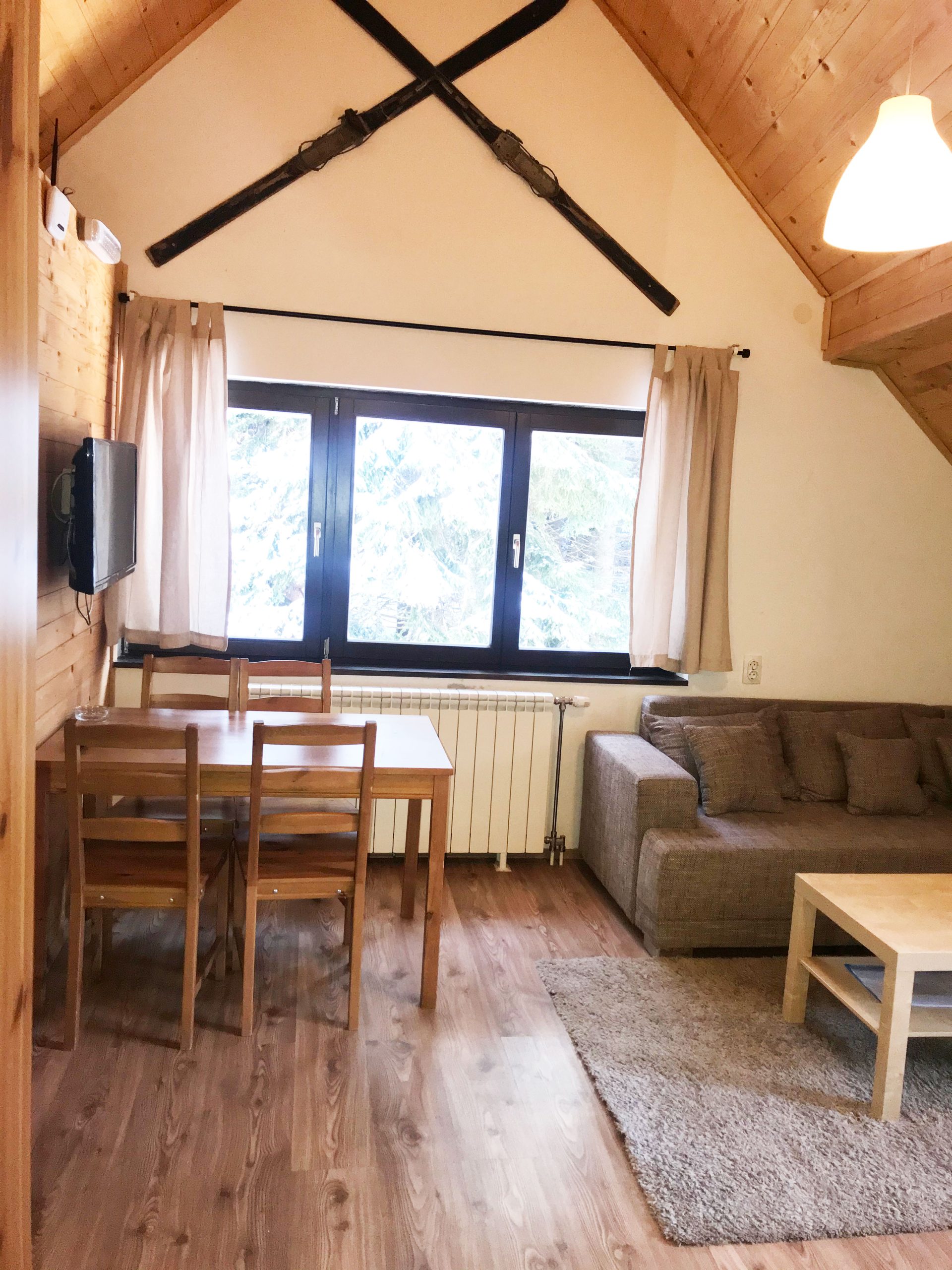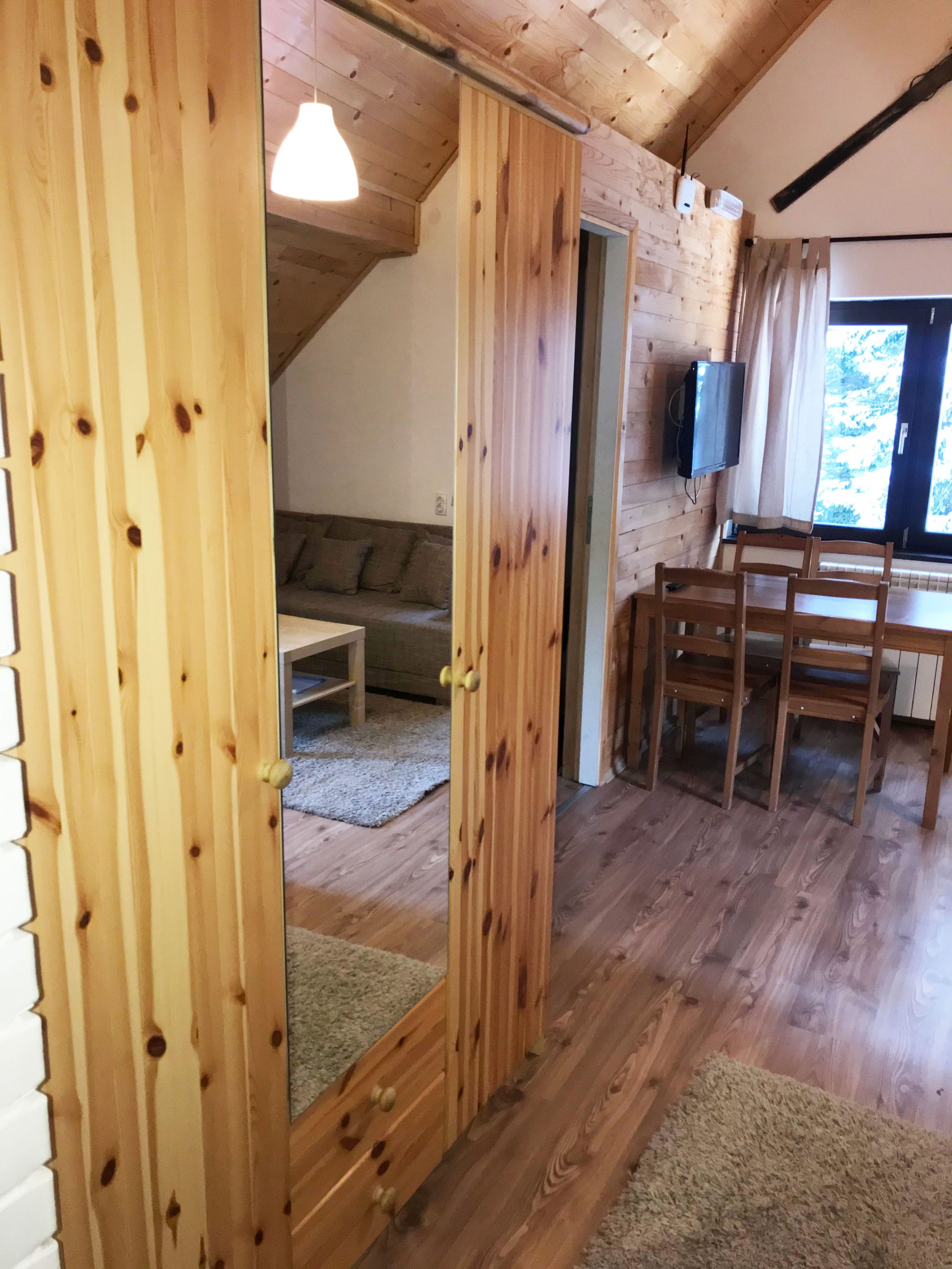 garniture na razvlačenje (dimenzije rasklopa 160x220cm). Jedna spavaća soba ima bračni ležaj širine 160 cm, a druge dve sobe francuski ležaj širine 140 cm.