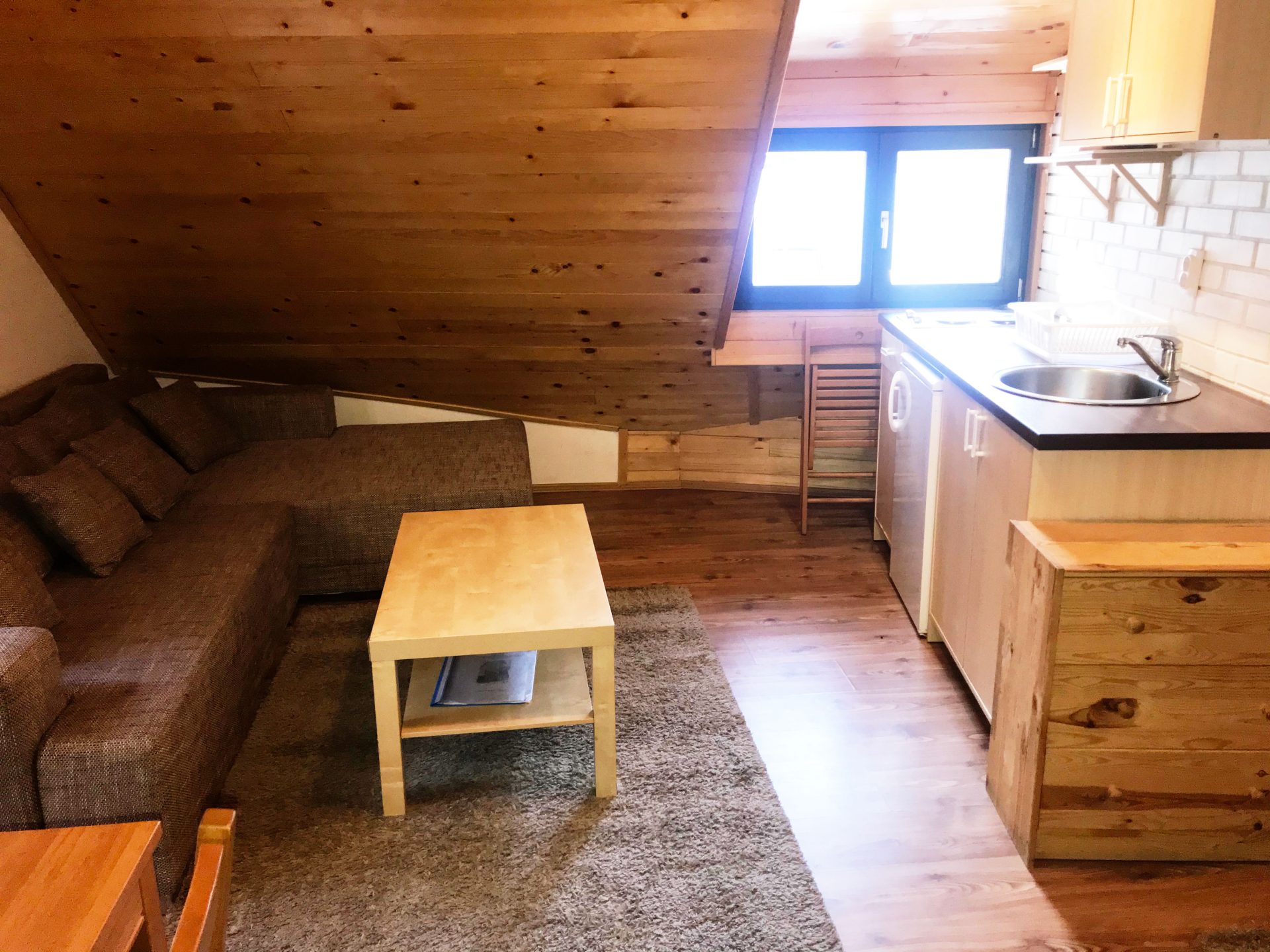 Dnevni boravak se sastoji od kompletno opremijene čajne kuhinje, trpezarije i ugaone