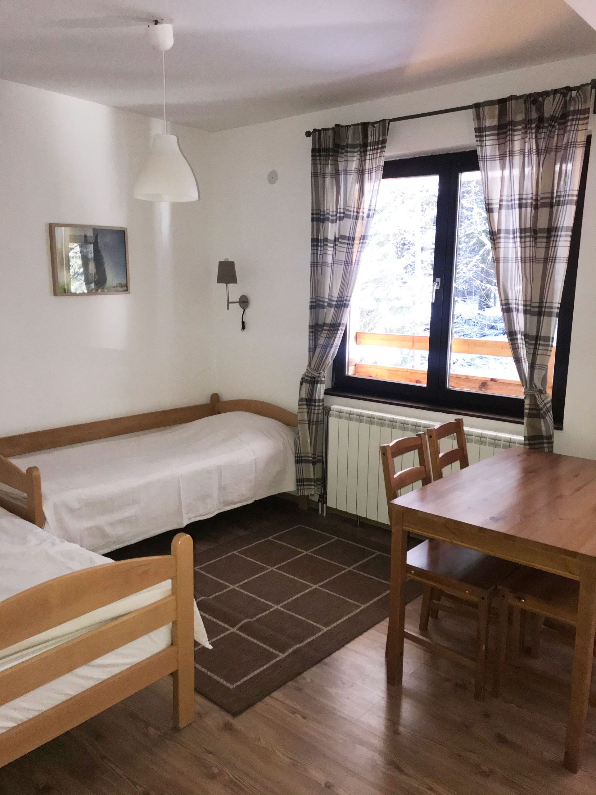 Apartmani 1 i 3 su okrenuti ka ulici, odnosno ka zapadu a apartmani 2 i 4 su okrenuti ka šumi, odnosno ka istoku. Sastoje se od komfornog dnevnog boravka, jedne odvojene spavaće sobe sa