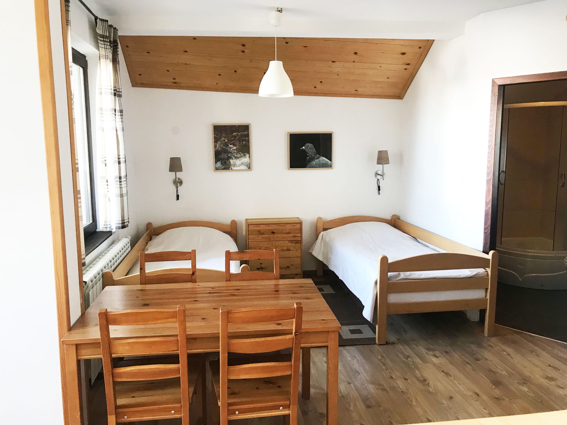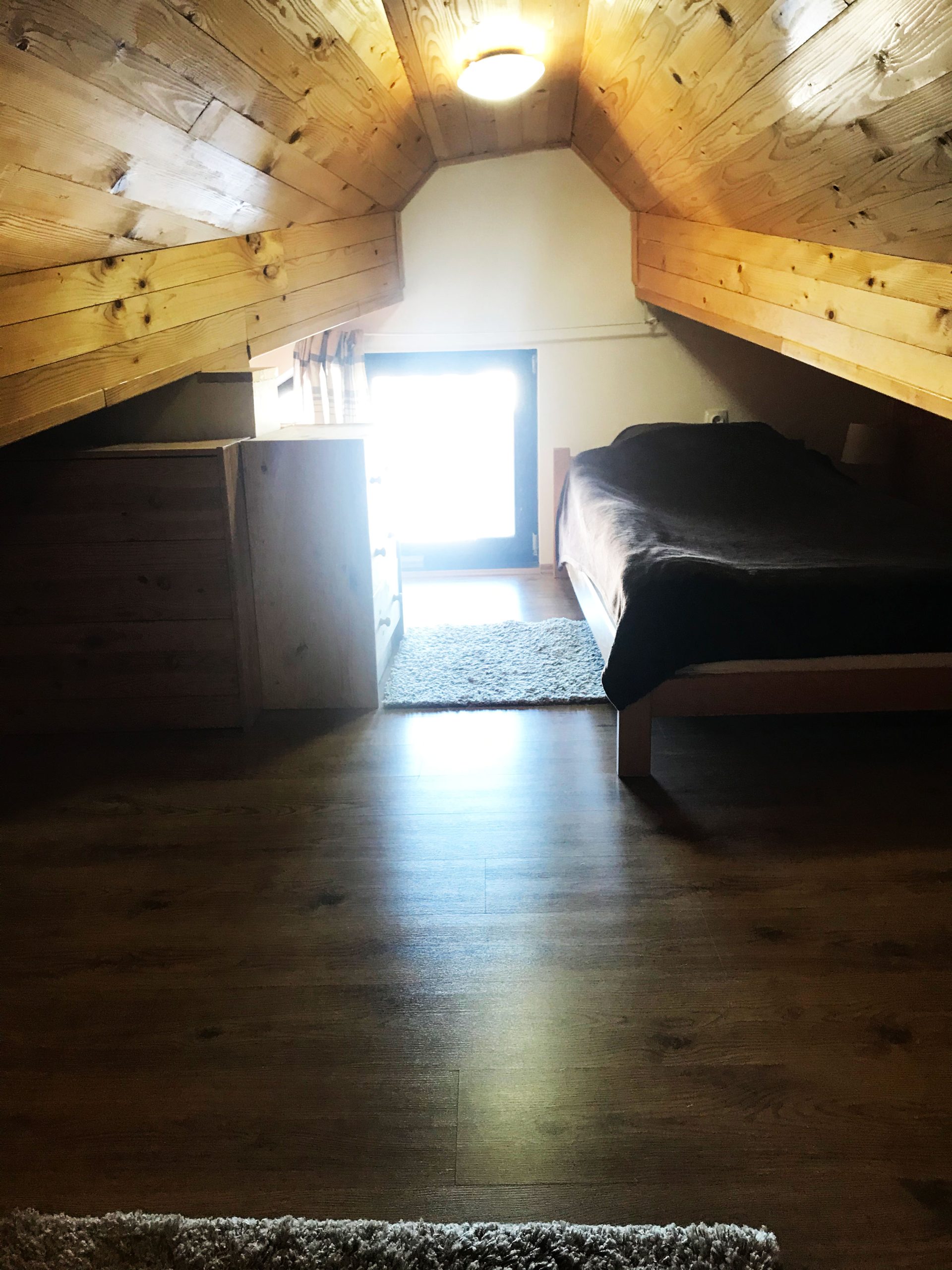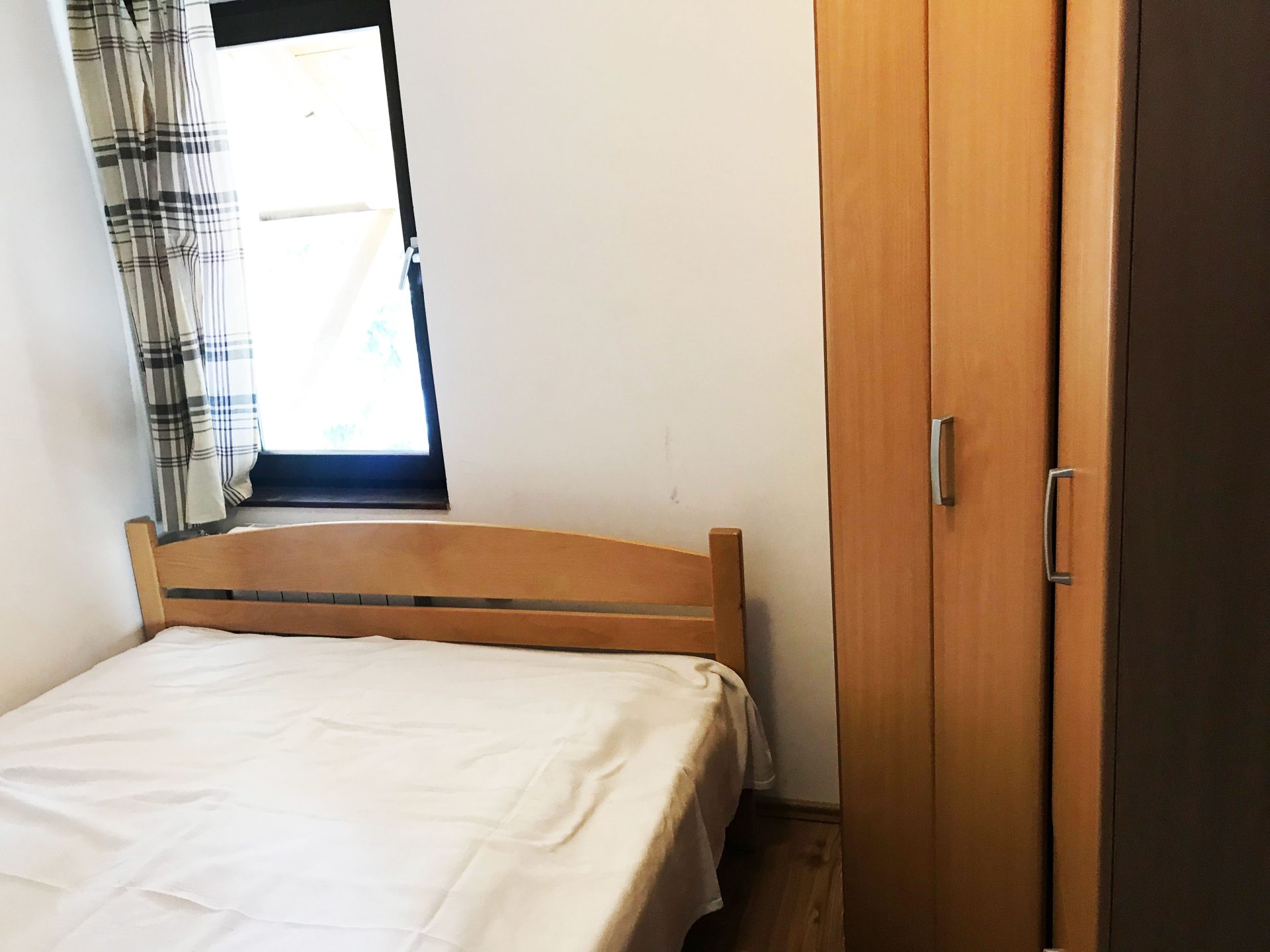 160x200cm) i dva odvojena singl kreveta. U potkrovlju se nalazi još jedna spavaća soba-galerija, veličine 17 kvm sa 3 kreveta. Apartman ima jedno tuš-kupatilo sa WC-om.