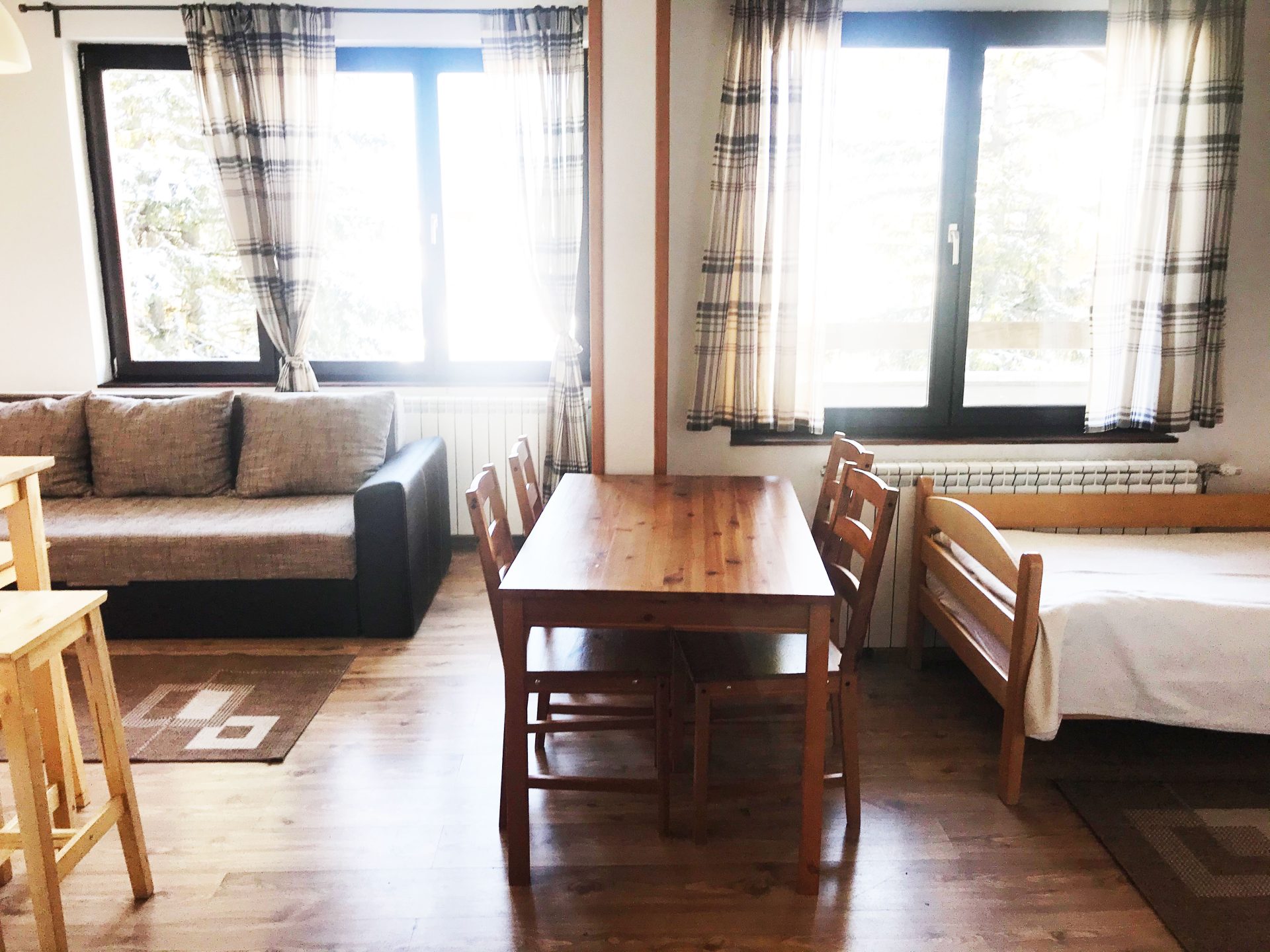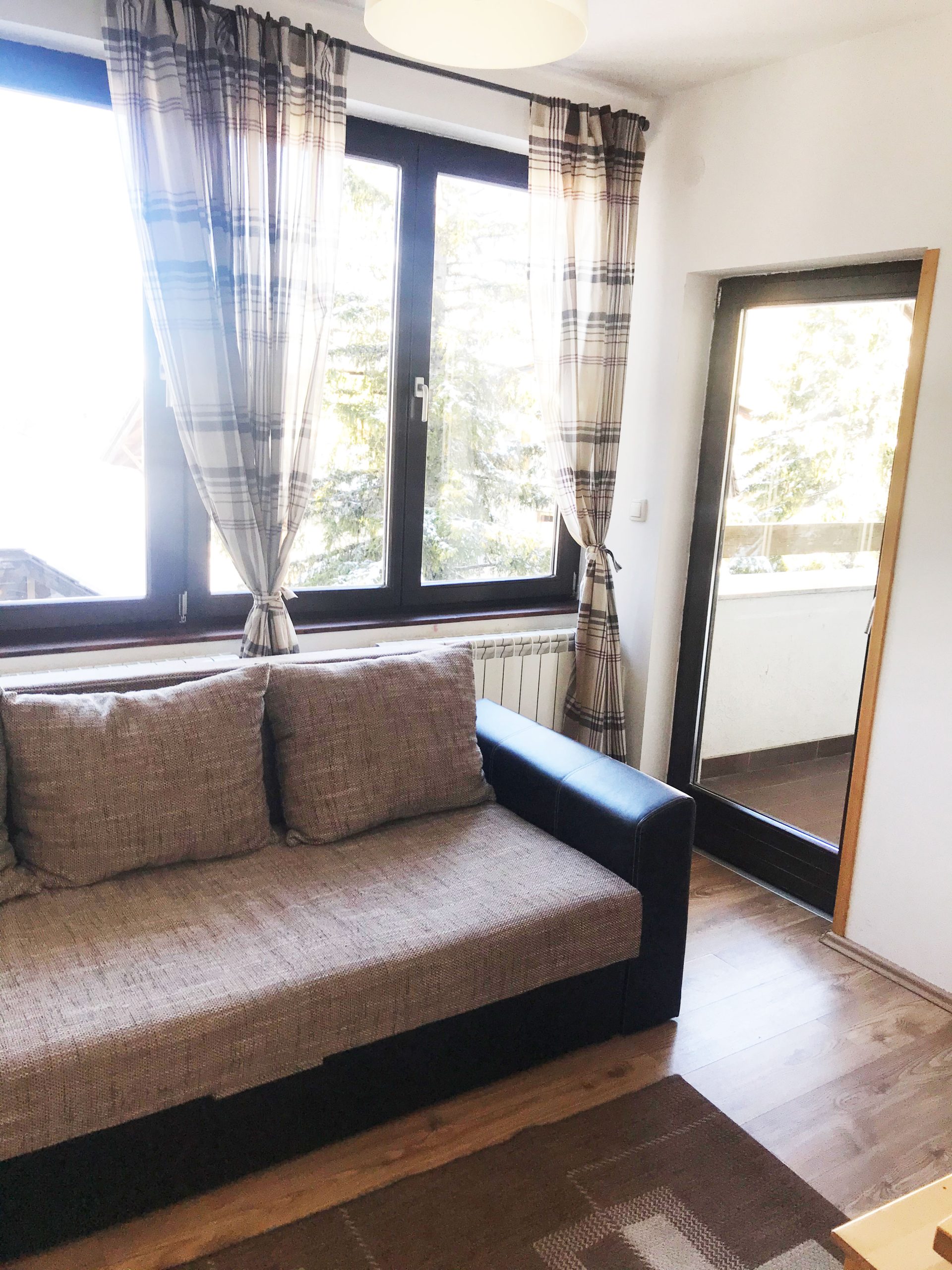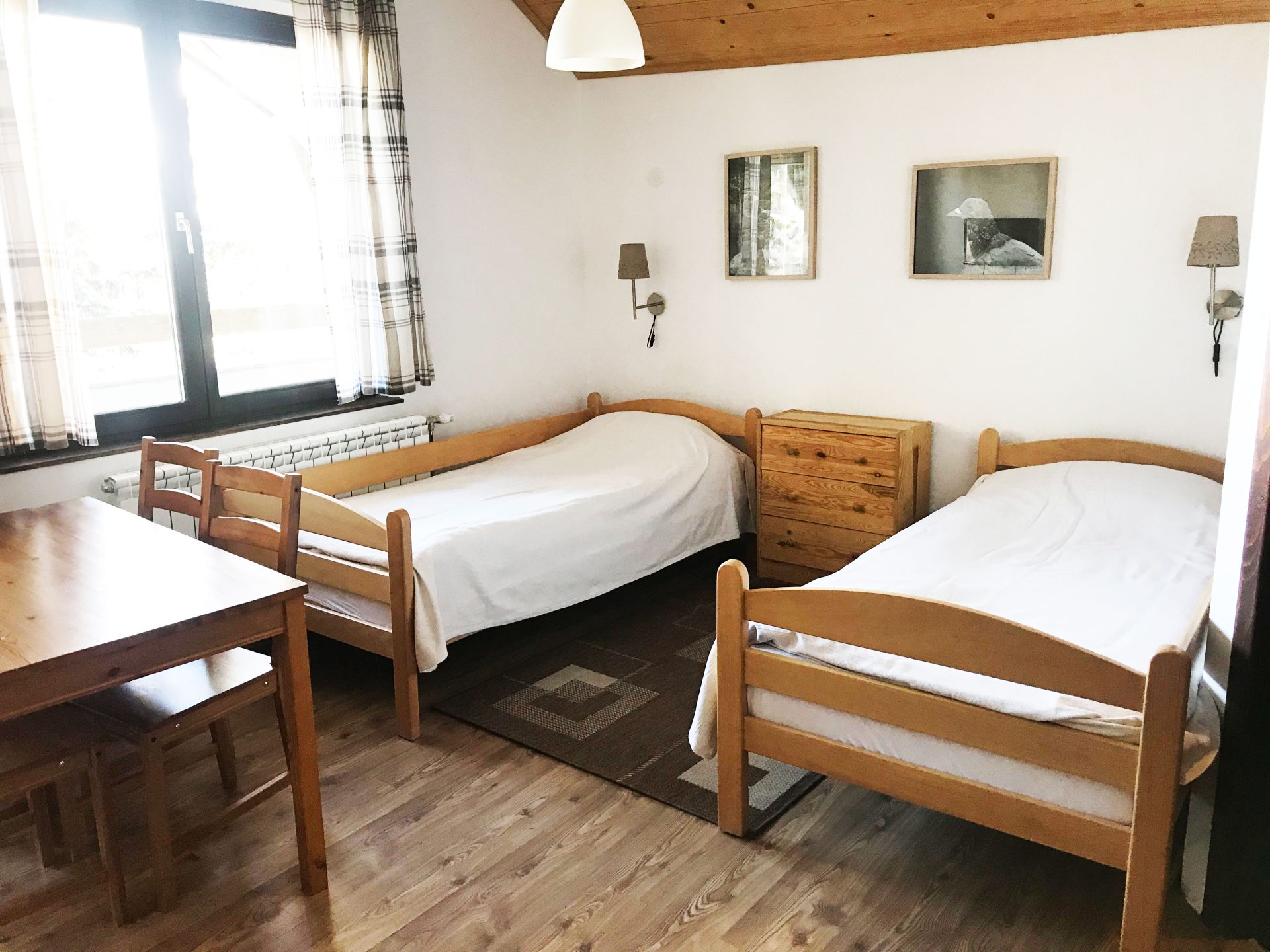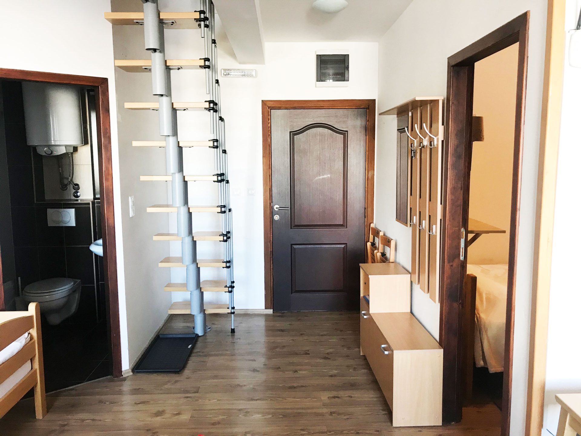 160x200cm) i dva odvojena singl kreveta. U potkrovlju se nalazi još jedna spavaća soba-galerija, veličine 17 kvm sa 3 kreveta. Apartman ima jedno tuš-kupatilo sa WC-om.